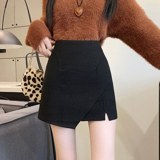 High Rise Plain Asymmetrical Panel Slit Mini A-Line Skirt