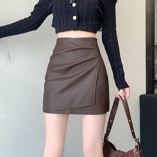 High Rise Plain Ruched Panel Faux Leather Mini A-Line Skirt
