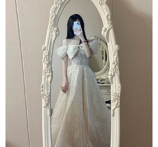 Cold-Shoulder Sequin Bow A-Line Evening Gown