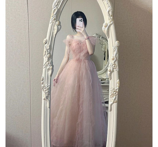 Spaghetti Strap Plain Bow Mesh Panel A-Line Evening Gown