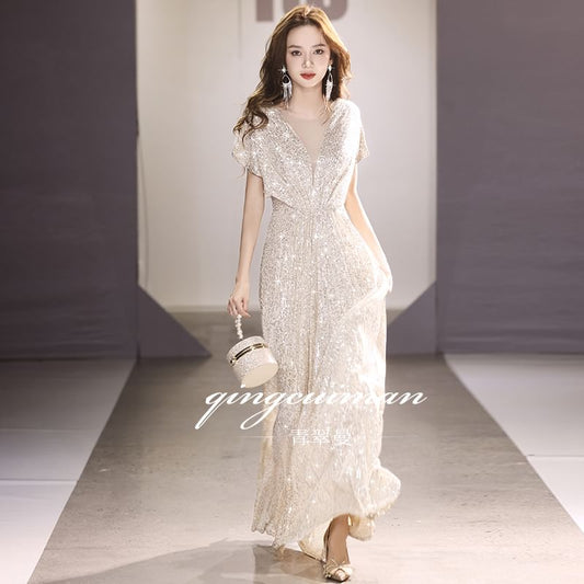 Short-Sleeve V-Neck Plain Sequin A-Line Evening Gown