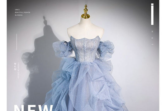 Off-Shoulder Puff-Sleeve Rhinestone Ruffled A-Line Evening Gown