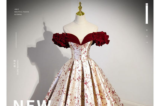 Off-Shoulder Floral Print Ruffled A-Line Evening Gown