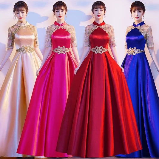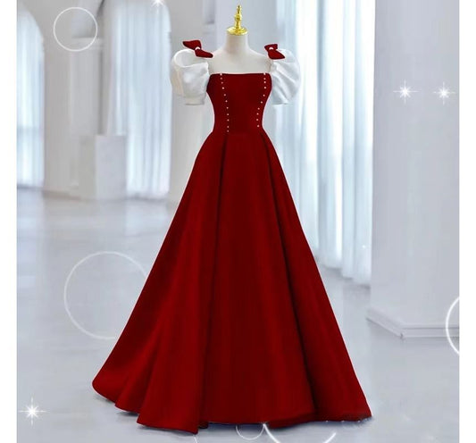 Puff-Sleeve Two Tone Bow A-Line Evening Gown