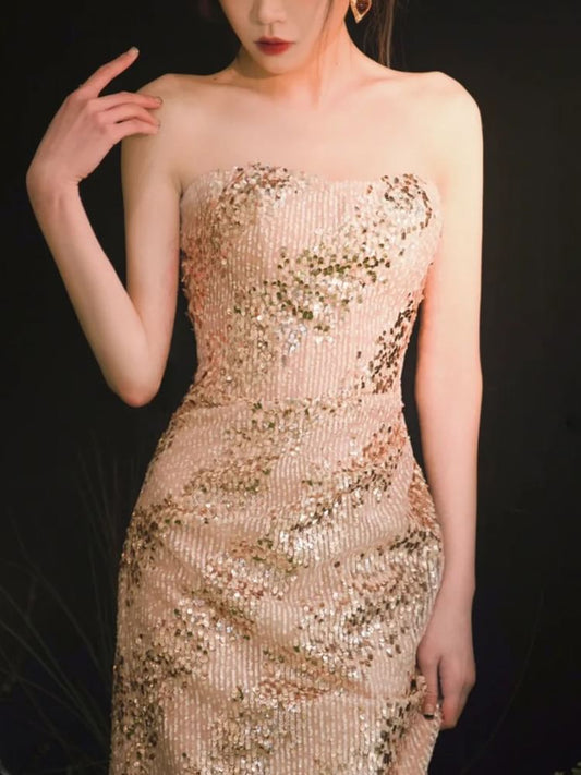 Sequin Peplum Panel Trumpet Tube Evening Gown