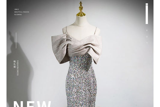 Spaghetti Strap Twisted Bow Sequined Mermaid Evening Gown