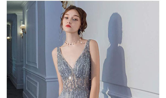 Elbow-Sleeve Sequin Mesh A-Line Evening Gown