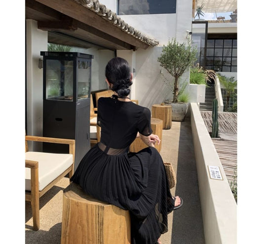 Short-Sleeve Halter-Neck Plain Drawstring Midi A-Line Layered Dress