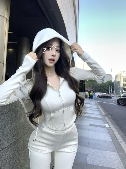 Hoodie Zip Crop High Plain / Sweatpants Flared Waist