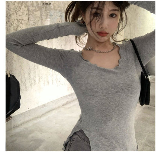 Long-Sleeve Oversized Neck Plain Round Slit T-Shirt