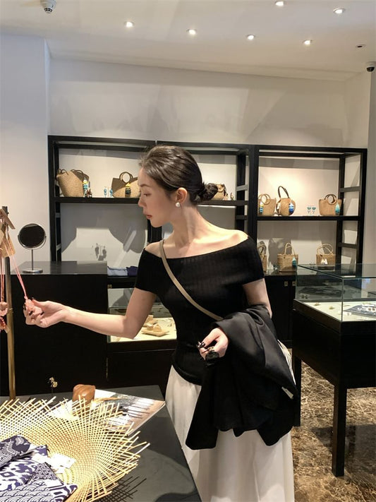 Shoulder Knit Short-Sleeve Off Ribbed Plain Top