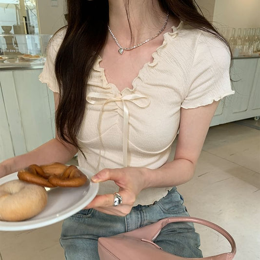 Top Plain Shoulder Off Short-Sleeve Twisted