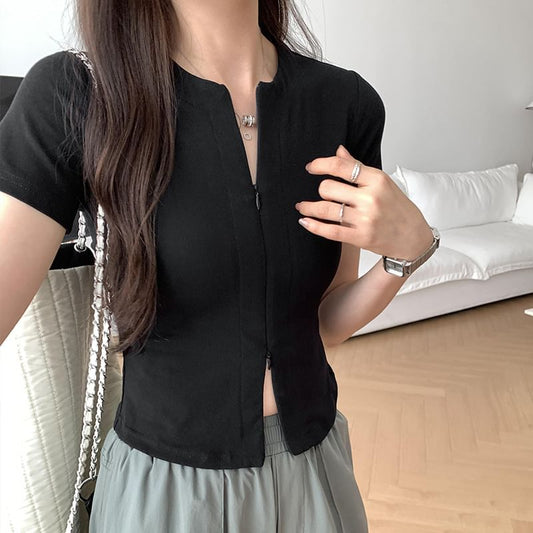 Scoop Short-Sleeve Plain Neck Top Henley Crop