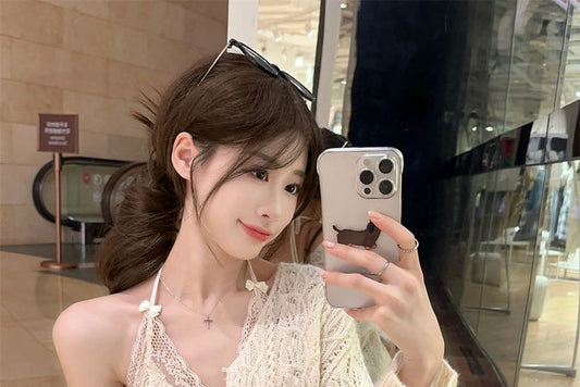 Halter Bow Lace Cami Top / V-Neck Pointelle Cardigan