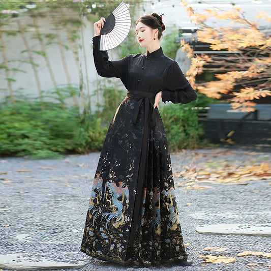 Traditional Chinese Long-Sleeve Stand Collar Plain Floral Jacquard Button-Up Top / High Rise Print Pleated Maxi A-Line Skirt