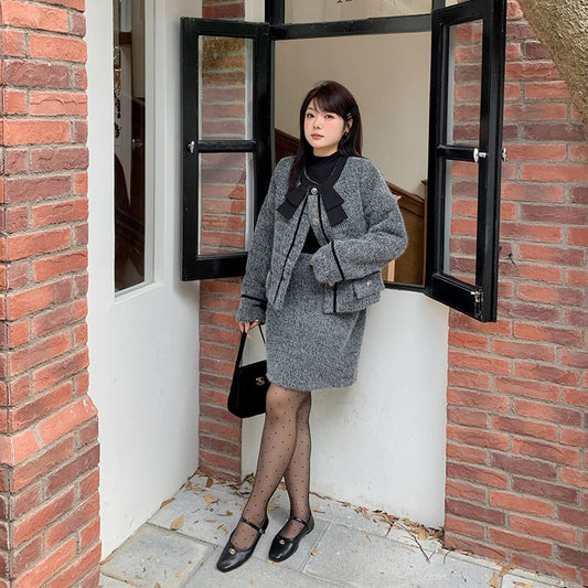 Round Neck Bow Tweed Button Jacket / High Rise Mini A-Line Skirt