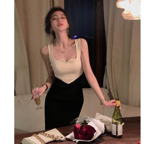 Retro Color Block Panel V-Neck Sheath Suspender Midi Knit Dress