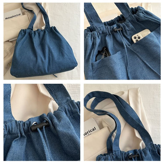 Puff-Sleeve Plain Ruffle Trim Drawstring Blouse