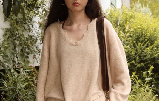 V-Neck Embroidered Ribbed Sweater / Drawstring Waist Plain Bootcut Pants / Striped Scarf