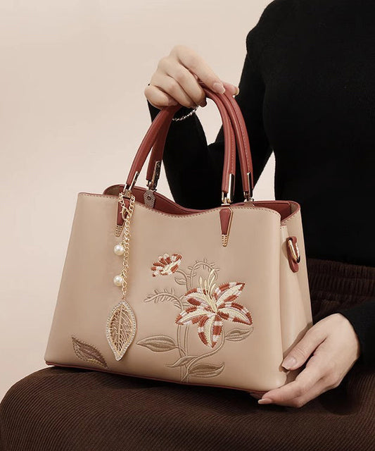 Leather Bag Apricot Embroidery Chic Tote Calf