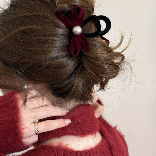 Velvet Bow Faux Pearl Hair Claw