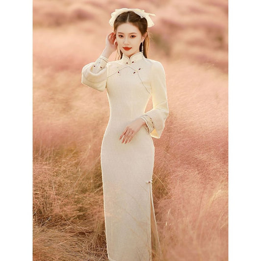 Long-Sleeve Embroidered Midi Qipao / Fluffy Trim Frog Button Vest