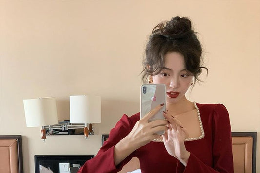 Square-Neck Long-Sleeve Plain Sheath Maxi Dress