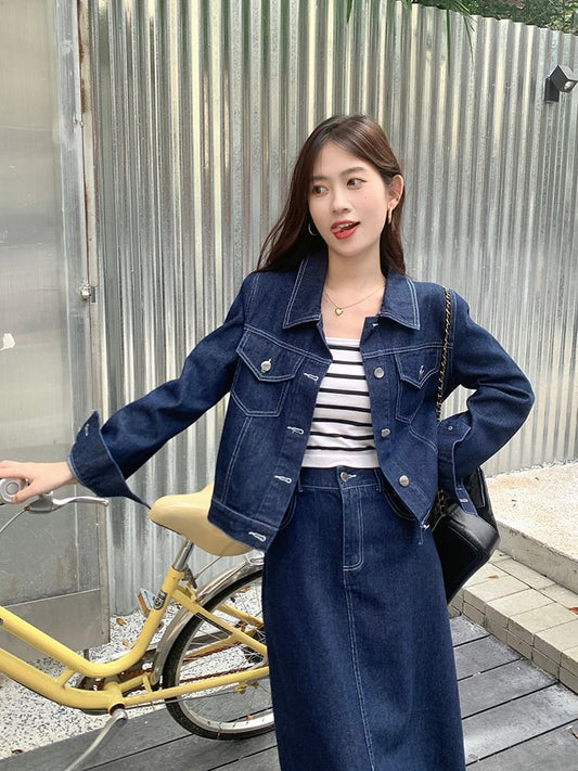 Set: Collared Plain Denim Button Jacket + Mid Rise Denim Midi A-Line Skirt
