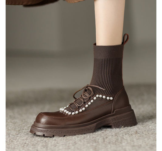 Lace-Up Faux Pearl Short Sock Boots