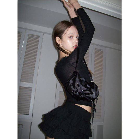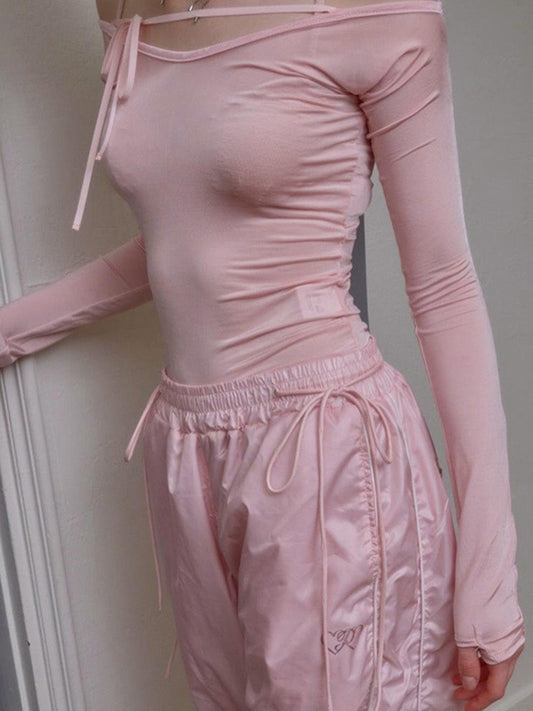 Haut rose slim à manches longues Pantalon cargo noir à lacets Y2k - Kimi