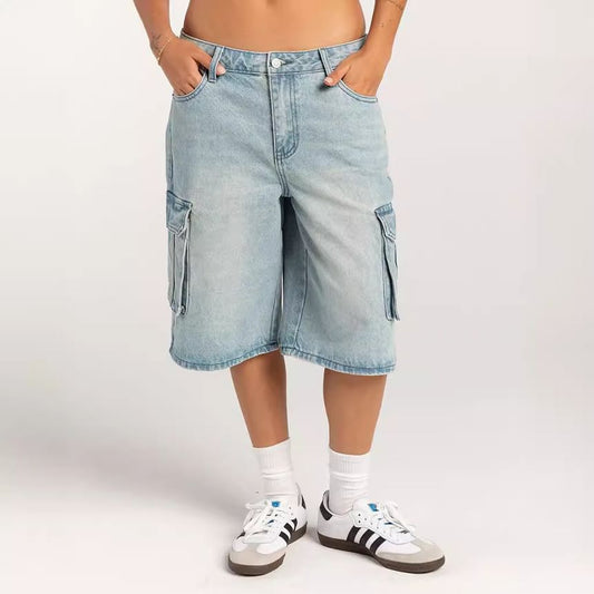 Denim Waist Washed Low Shorts Pocket Straight-Leg