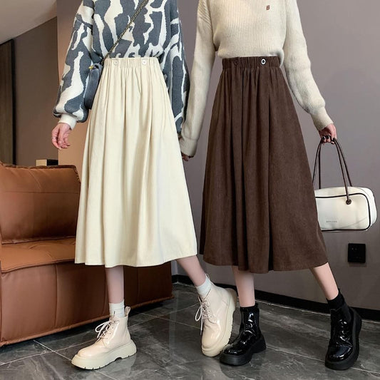 Skirt Midi Elastic Plain Pocket A-Line Waist