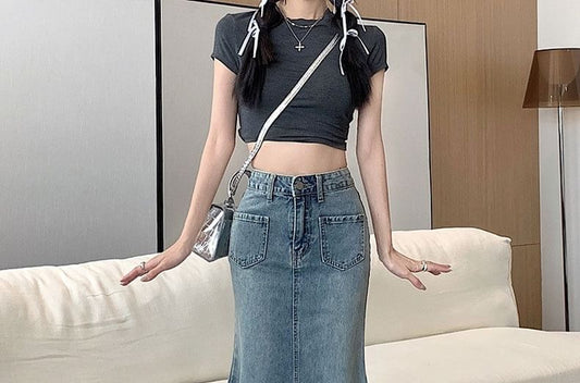 Mermaid Denim High Fray Waist Washed Midi Skirt