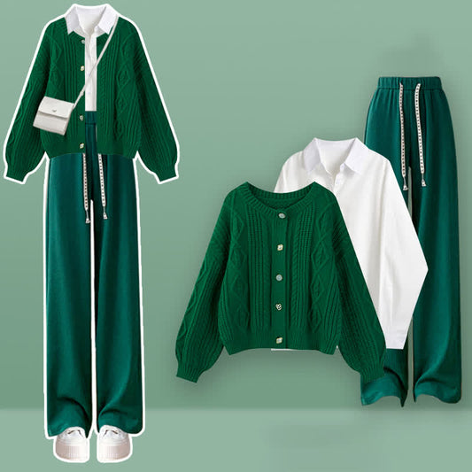 Cable Green Cardigan Sweater Lapel Shirt Denim Pants Set