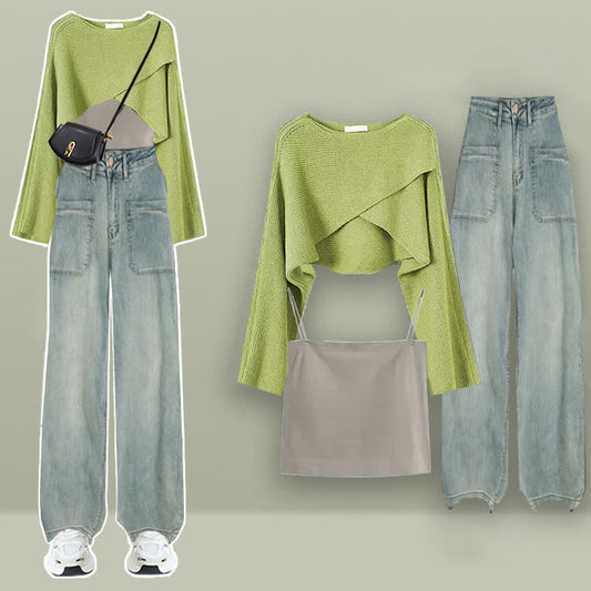 Green Cross Knit Crop Sweater Cami Pocketed Denim Pants