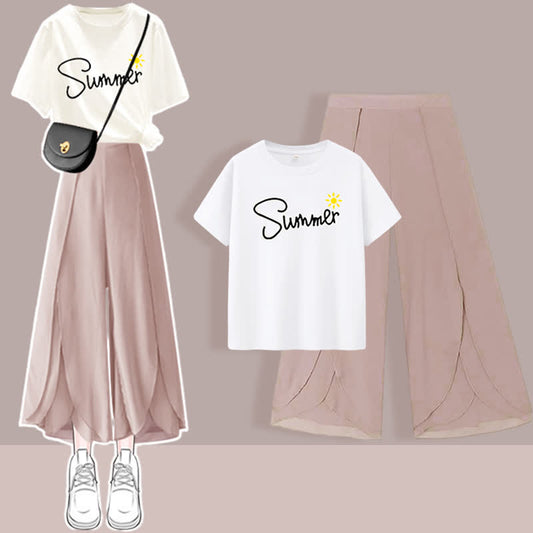 Printed T-Shirt Chiffon Pleated Split Pants Set