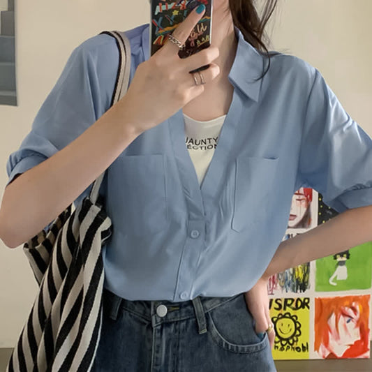 Fake Two Pieces Lapel T-Shirt Pocketed Denim Shorts