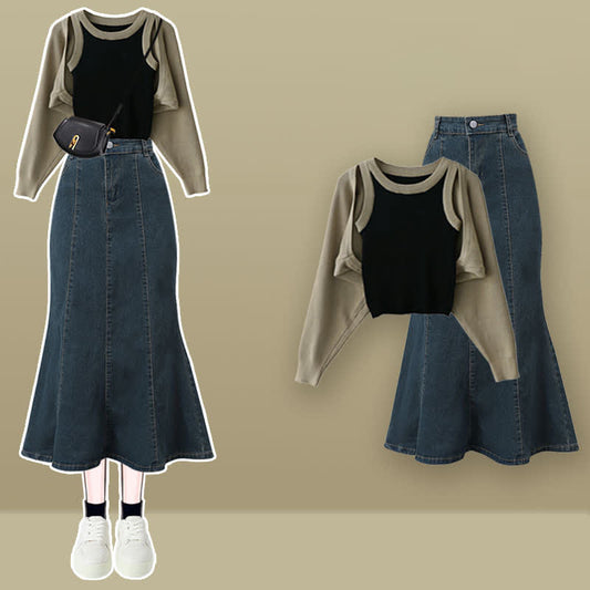 Chic Knitted Cardiagn Cami Top Denim Skirt