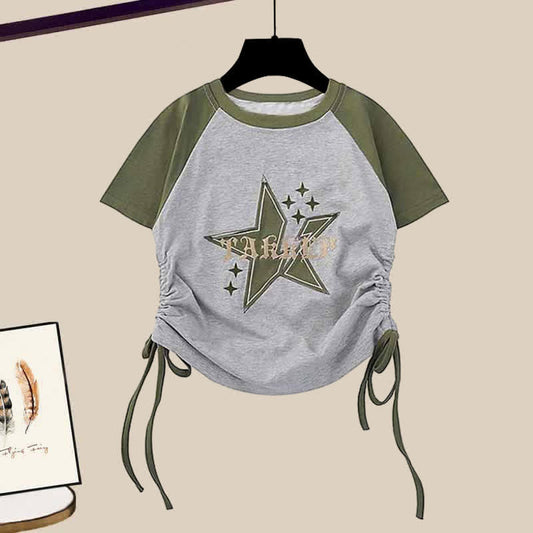 Green Colorblock Star Letter Crop Top T-Shirt Cargo Pants