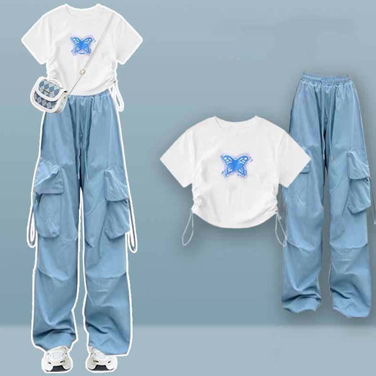 Butterfly Print Draw String T-Shirt Pocketed Cargo Pants