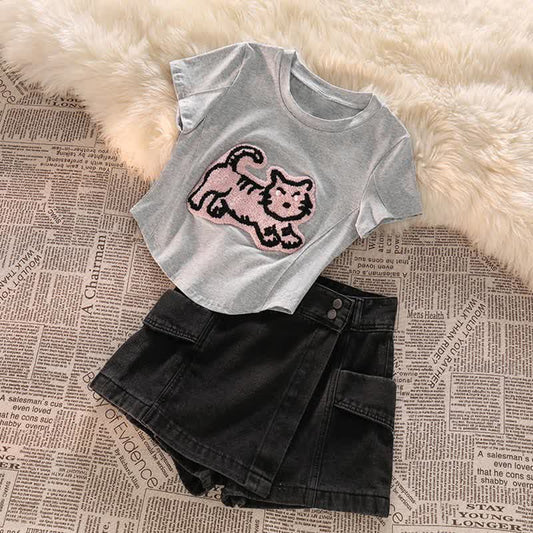 Pink Tiger Embroidery Crop Top T-Shirt Denim Shorts