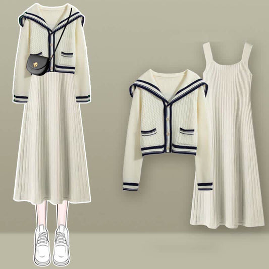 Sailor Collar Cable Sweater Slip Dress Denim Skirt