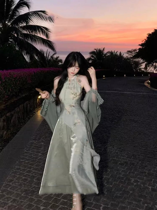 Halter-Neck Floral Print Midi A-Line Dress / Ruffled Jacket
