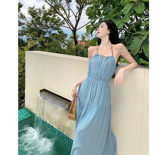 Halter-Neck Chained Plain Shirred Midi A-Line Dress
