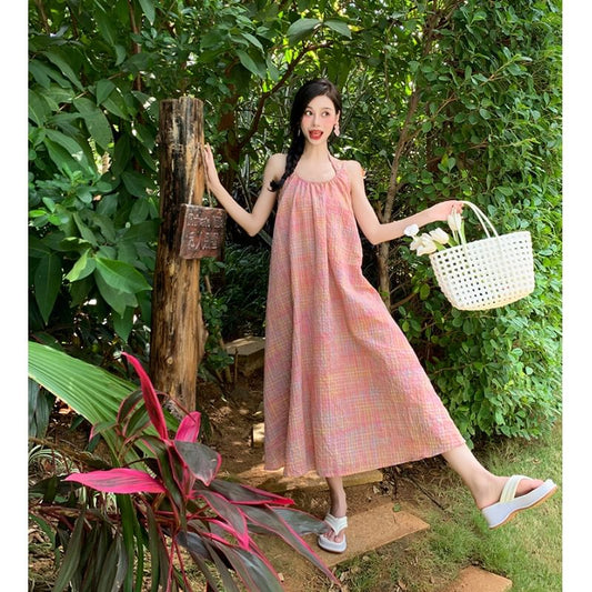 Halter-Neck Plaid Shirred Midi Sundress