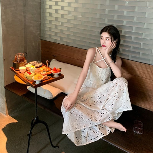 Spaghetti Strap Midi A-Line Eyelet Lace Dress