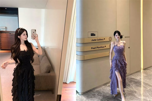 Ruffle Plain Lace Strap Slit Ruched Maxi A-Line Panel Spaghetti Dress