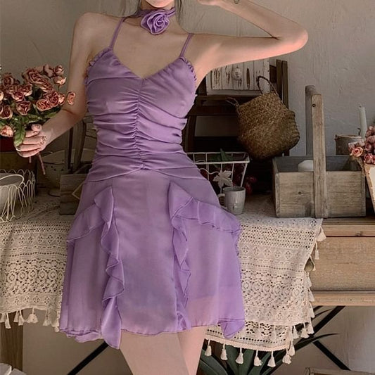 Spaghetti Plain A-Line Dress Strap Ruched Ruffle Mini