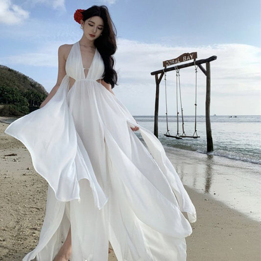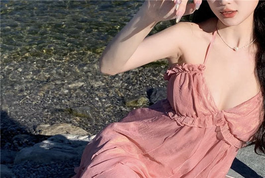 Trim Plain A-Line Halter Maxi Ruffle Dress V-Neck