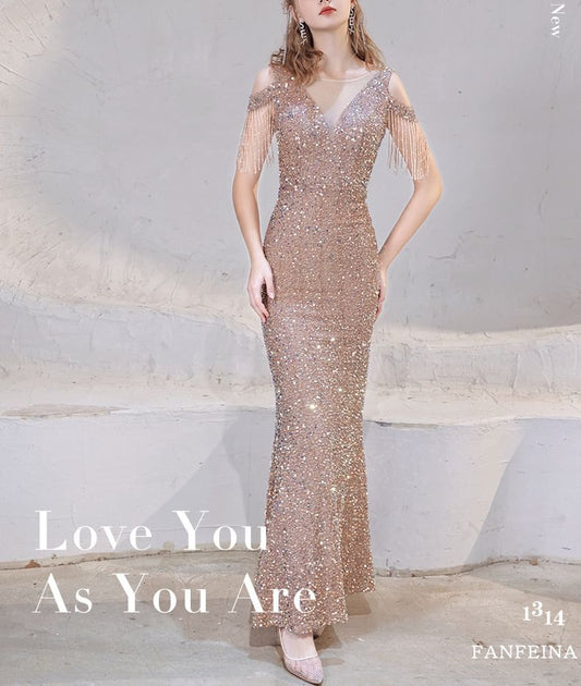 Trumpet Beaded Cap Shoulder Sleeve Cold Fringe Dress Sequin Evening